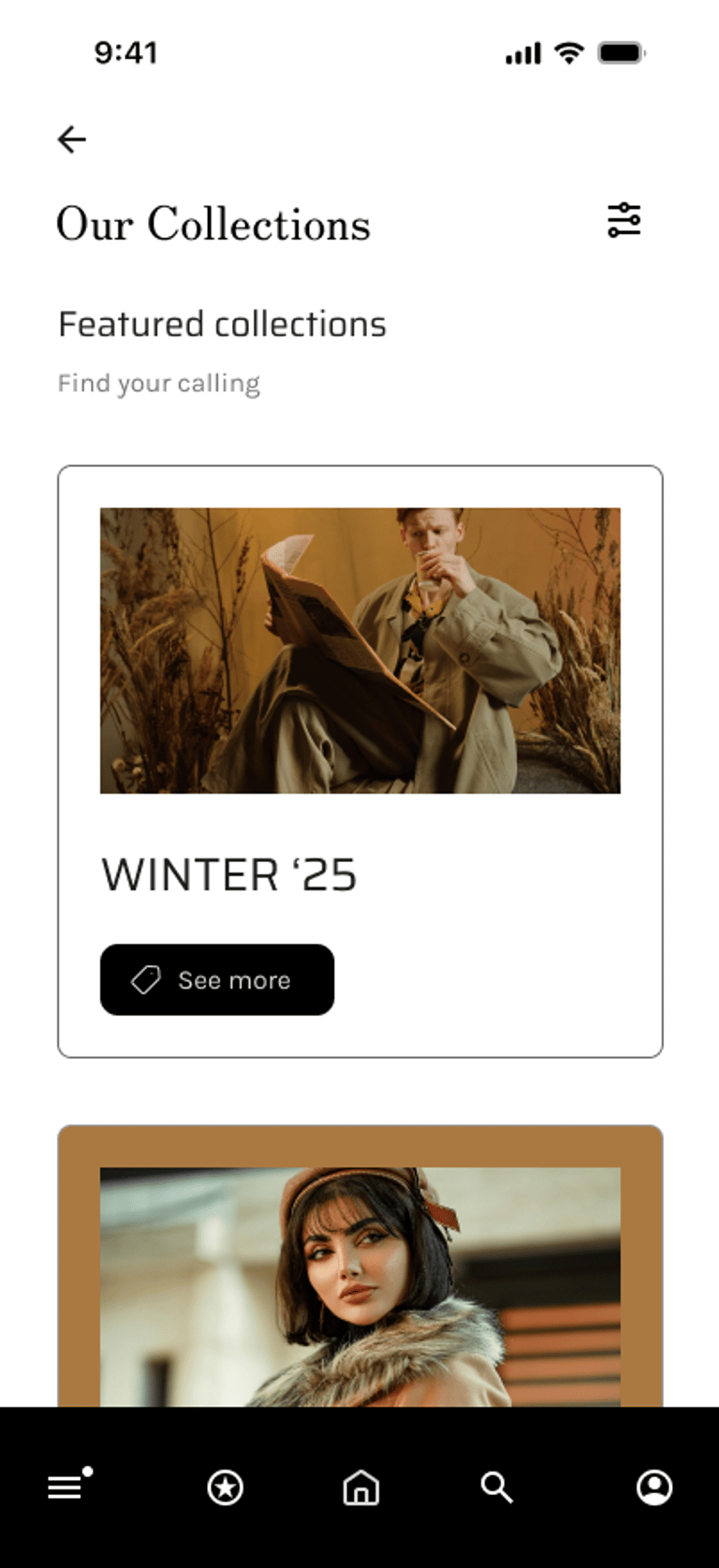 Collections Page, including filters and navigation