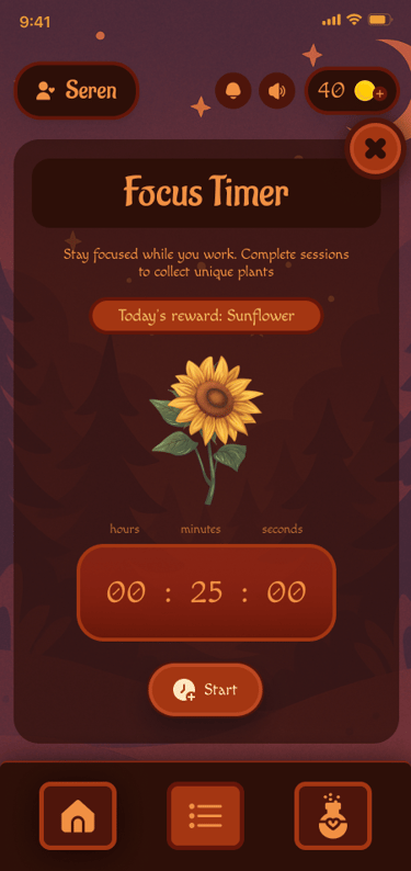 Focus Timer with unlockable rewards, issued for a certain number of minutes spent focusing