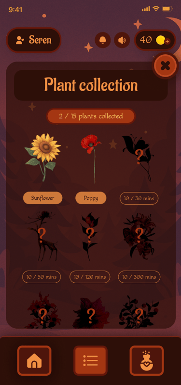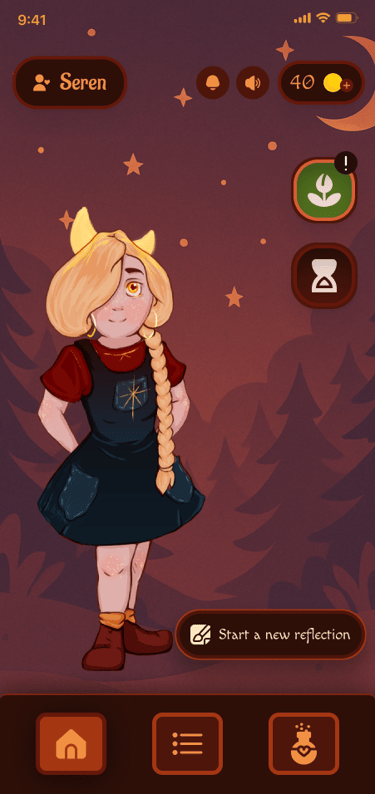 Having completed research, I moved to webflow development and wireframing. In my design and colour choices, I made sure to reflect the backstory of the game - a house in the woods, where a young girl, Seren, lives. To maintain this story, I chose warm tones and brown shades. As for UI, I focused on making the appearance cozy by making rounded corners, stylised icons, and subtle animations.